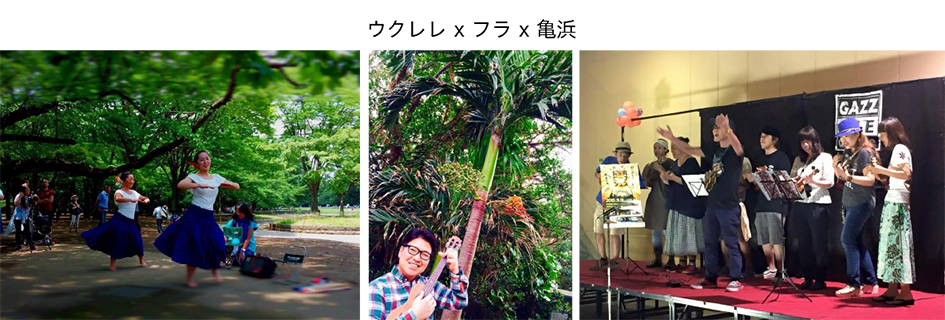 続いて、野外ステージの出演者でもある「亀濱貴士」と本格フラダンサーKAO率いる「カオフラチーム」と「ガズレレ」が、このステージでコラボします。